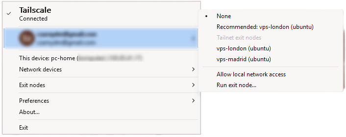 In order to enable the VPS as the exit node, all you have to do is simply right-click on the Tailscale icon, select Exit Nodes and select the VPS.